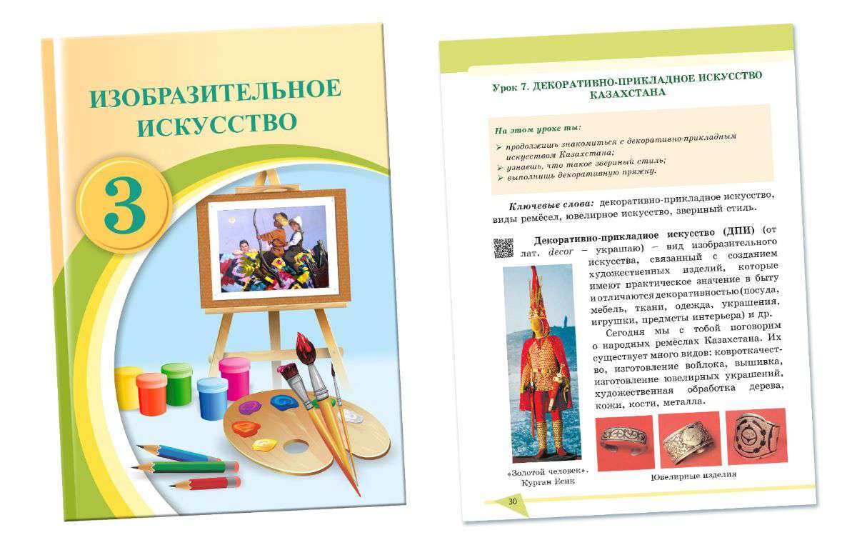 В разделы – их в учебнике 8 – включены сведения о природе, о выдающихся людях и праздниках Казахстана, овидах и жанрах изобразительного искусства,об обычаях и традициях казахского народа.